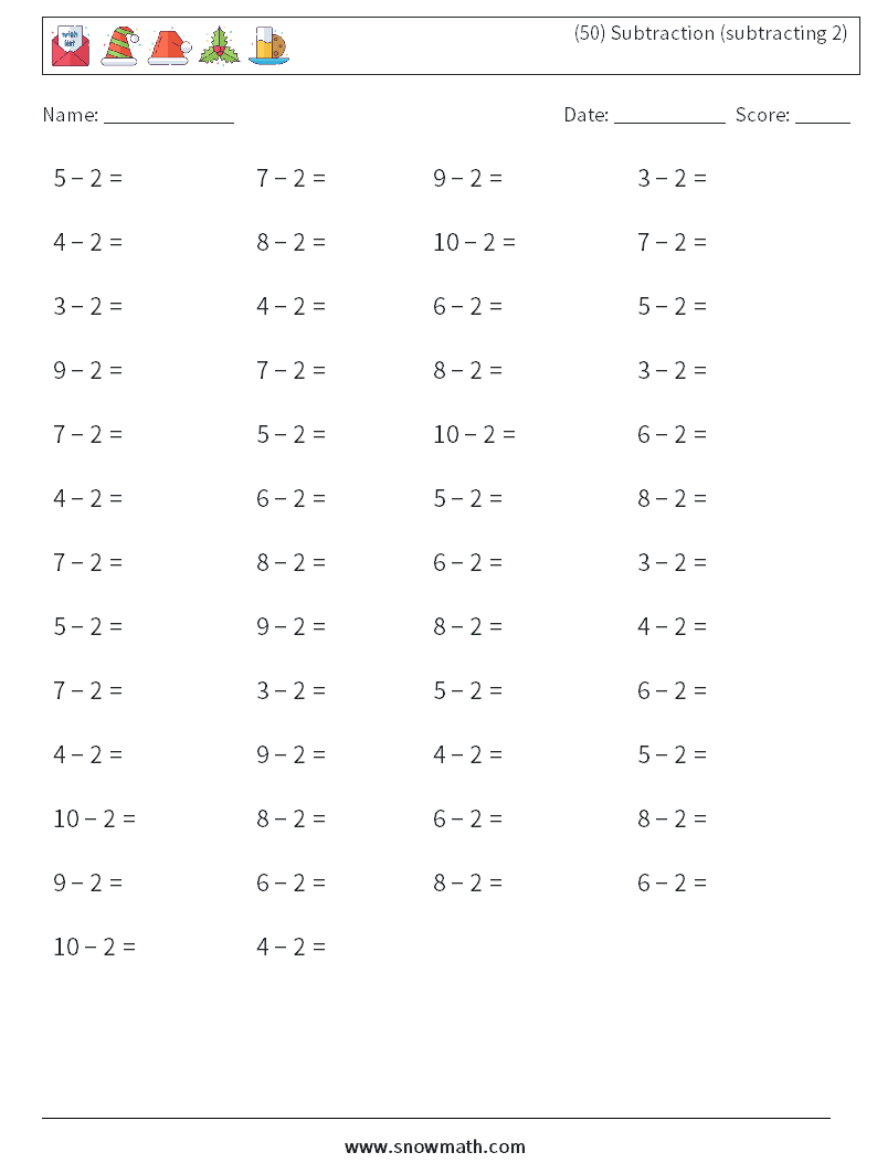 (50 math questions) Print subtraction worksheets, subtracting 2,kid's math
