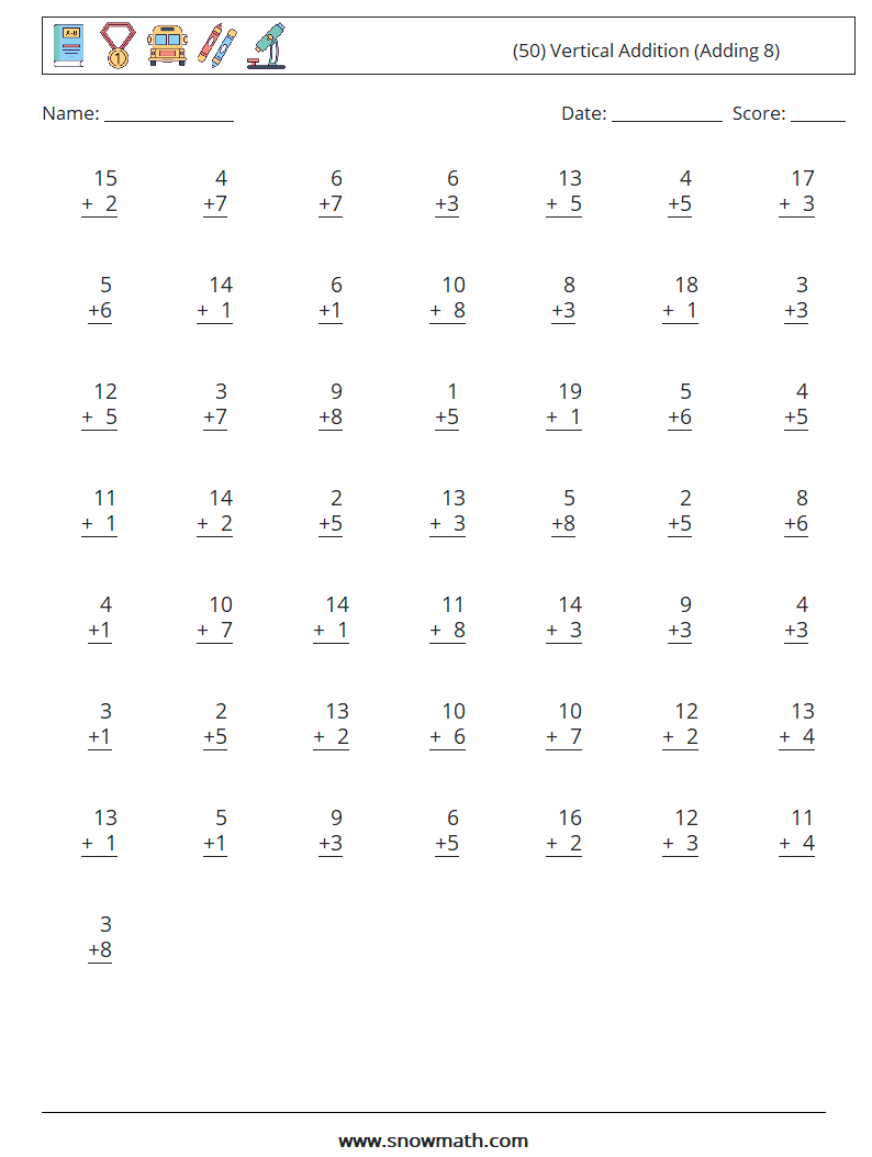 (50) Vertical Addition (Adding 8) Maths Worksheets 15