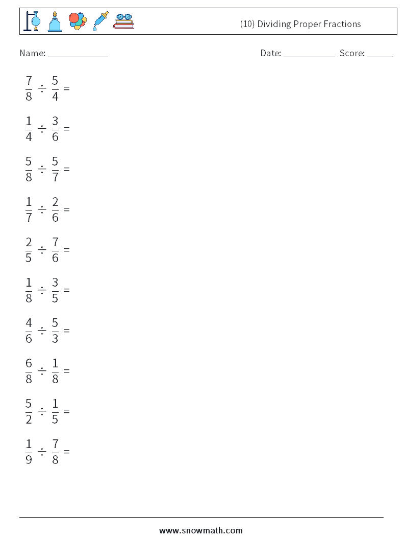 (10 math questions) division of proper fractions and improper fractions . download free math worksheets.