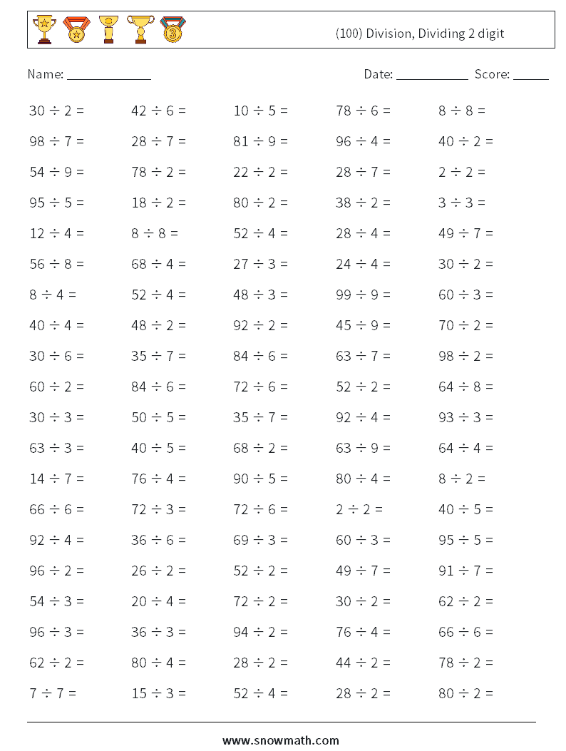 (100) Division, Dividing 2 digit Math Worksheets 1