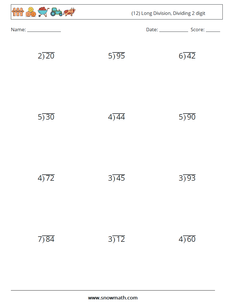 (12) Long Division, Dividing 2 digit Math Worksheets 3