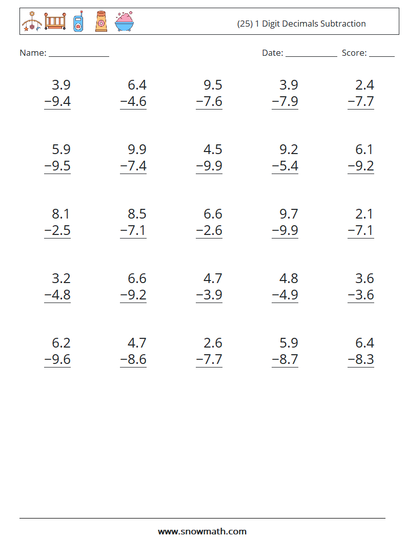 (25) 1 Digit Decimals Subtraction Math Worksheets 6