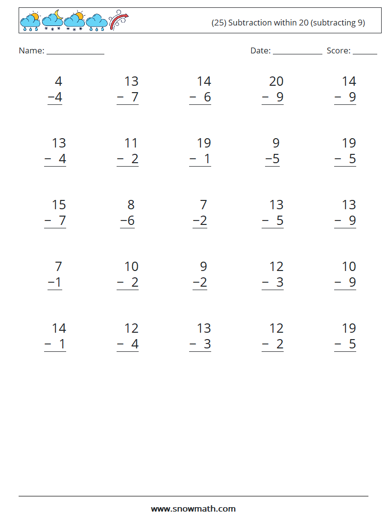 (25 math questions) Subtraction within 20, subtracting 9,primary school math