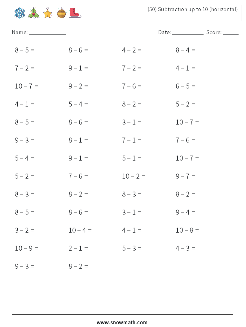 (50) Subtraction up to 10 (horizontal) Math Worksheets 1