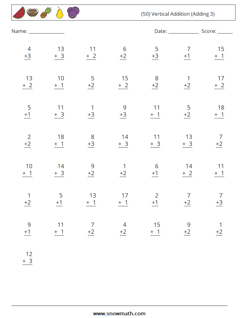 (50) Vertical Addition (Adding 3) Math Worksheets 1
