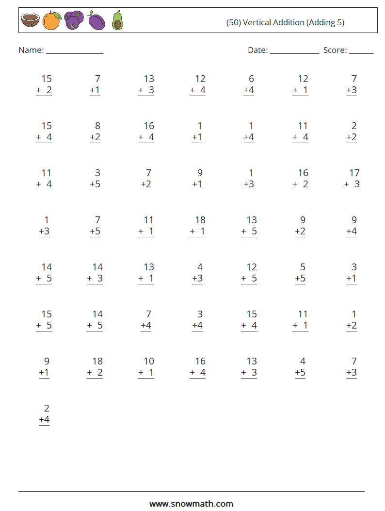 (50) Vertical Addition (Adding 5) Math Worksheets 1