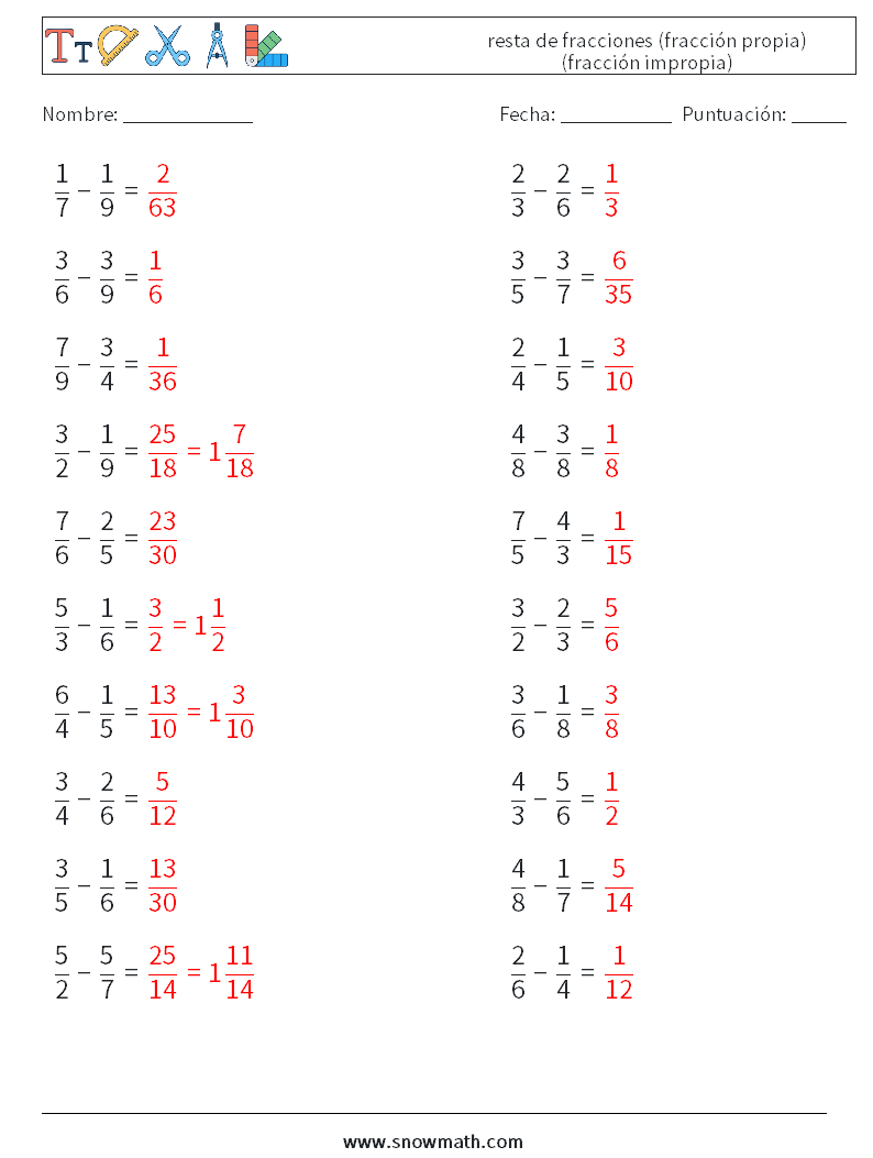 (20) resta de fracciones (fracción propia) (fracción impropia)