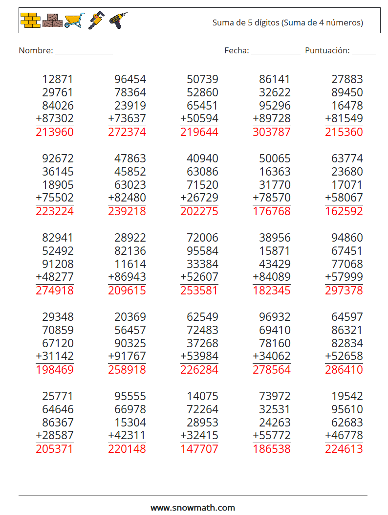 (25) Suma de 5 dígitos (Suma de 4 números)