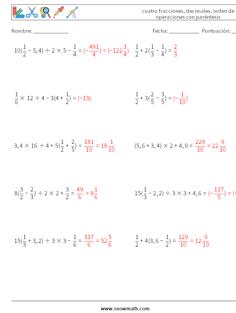 (10) cuatro fracciones, decimales, orden de operaciones con paréntesis