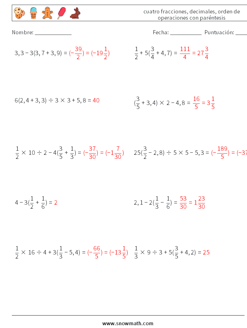 (10) cuatro fracciones, decimales, orden de operaciones con paréntesis
