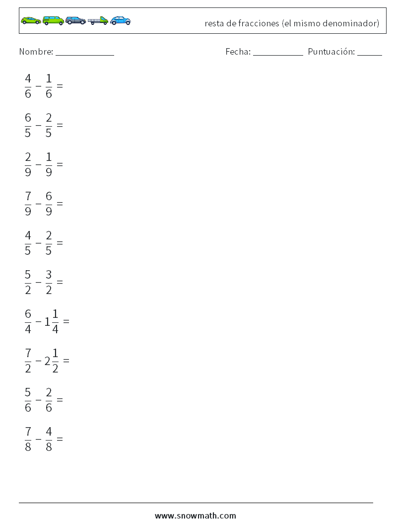 (10) resta de fracciones (el mismo denominador) Hojas de trabajo de matemáticas 10