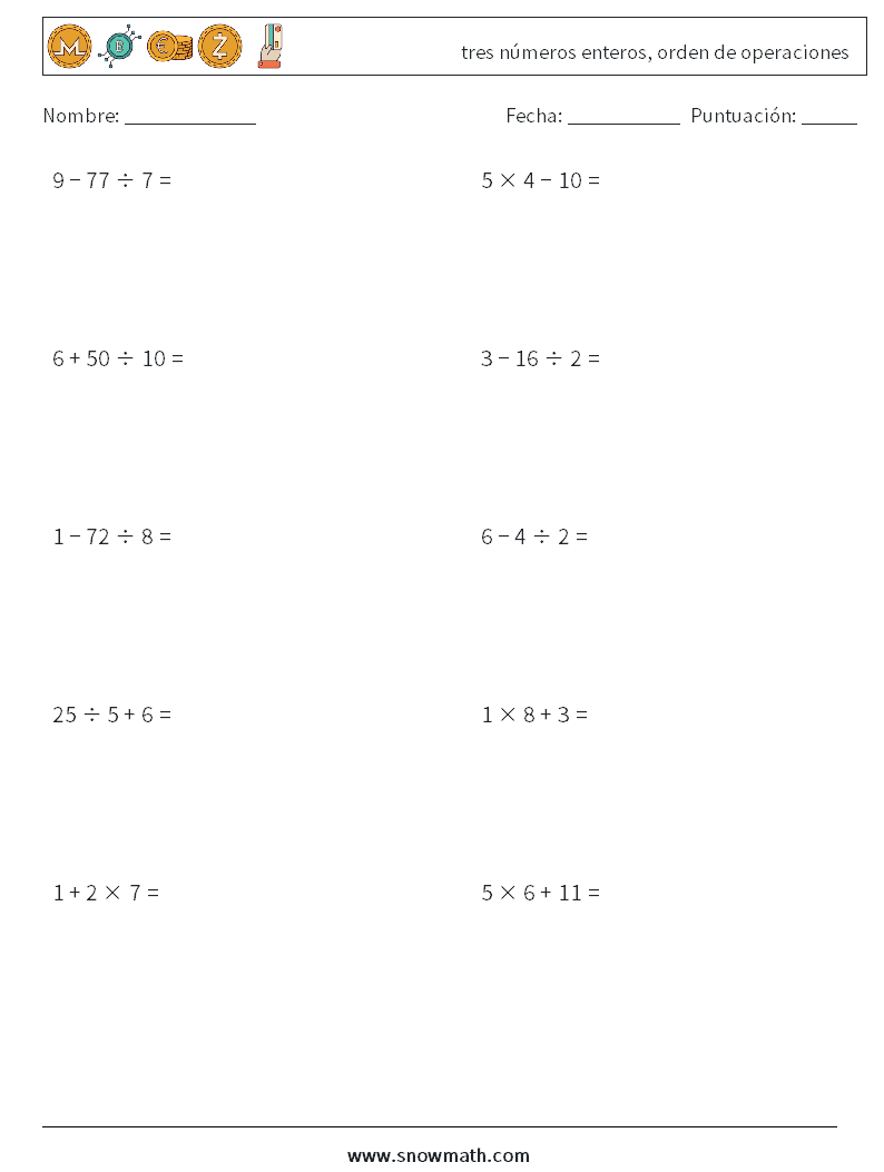 (10) tres números enteros, orden de operaciones Hojas de trabajo de matemáticas 10