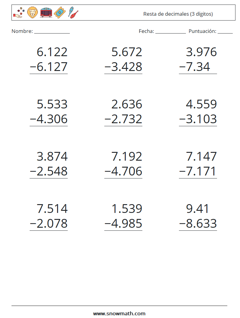 (12) Resta de decimales (3 dígitos) Hojas de trabajo de matemáticas 3