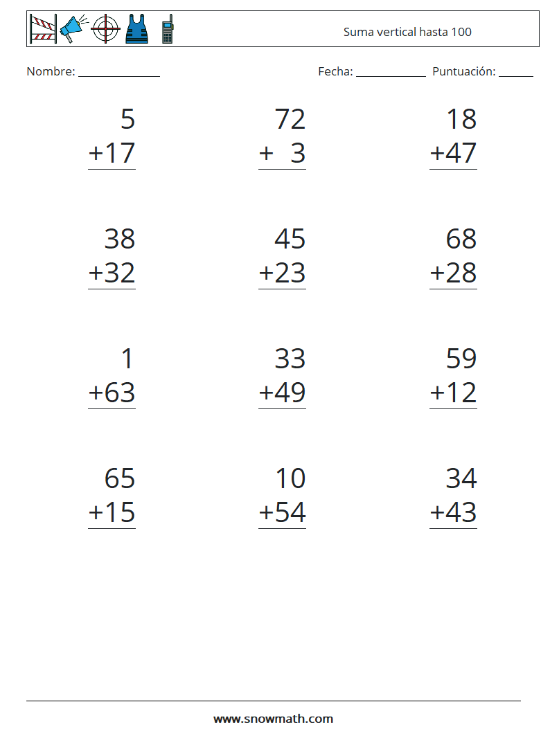 (12) Suma vertical hasta 100 Hojas de trabajo de matemáticas 3