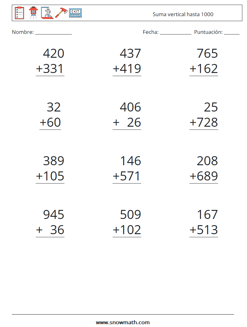 (12 preguntas de matemáticas) Estudie la suma vertical hasta 1000. descarga de hojas de trabajo de matemáticas.