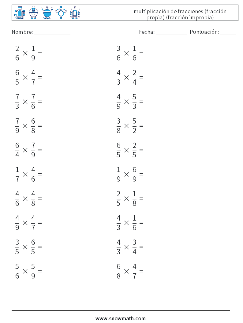 (20) multiplicación de fracciones (fracción propia) (fracción impropia) Hojas de trabajo de matemáticas 10