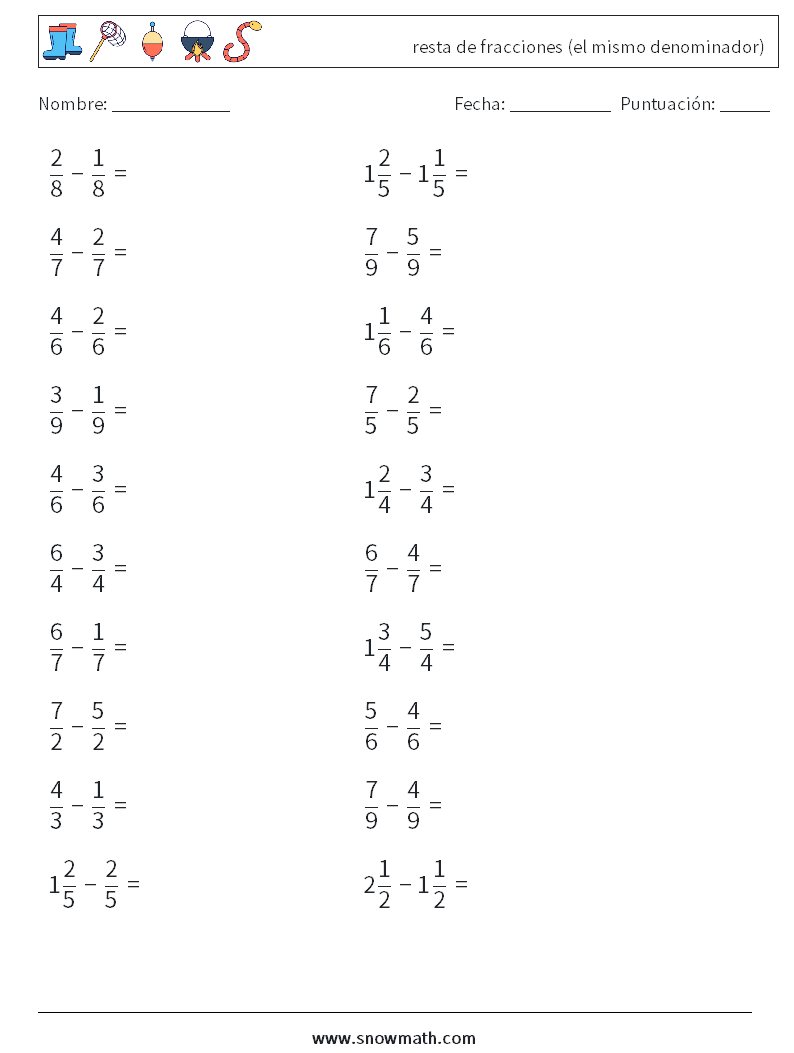 (20) resta de fracciones (el mismo denominador) Hojas de trabajo de matemáticas 2
