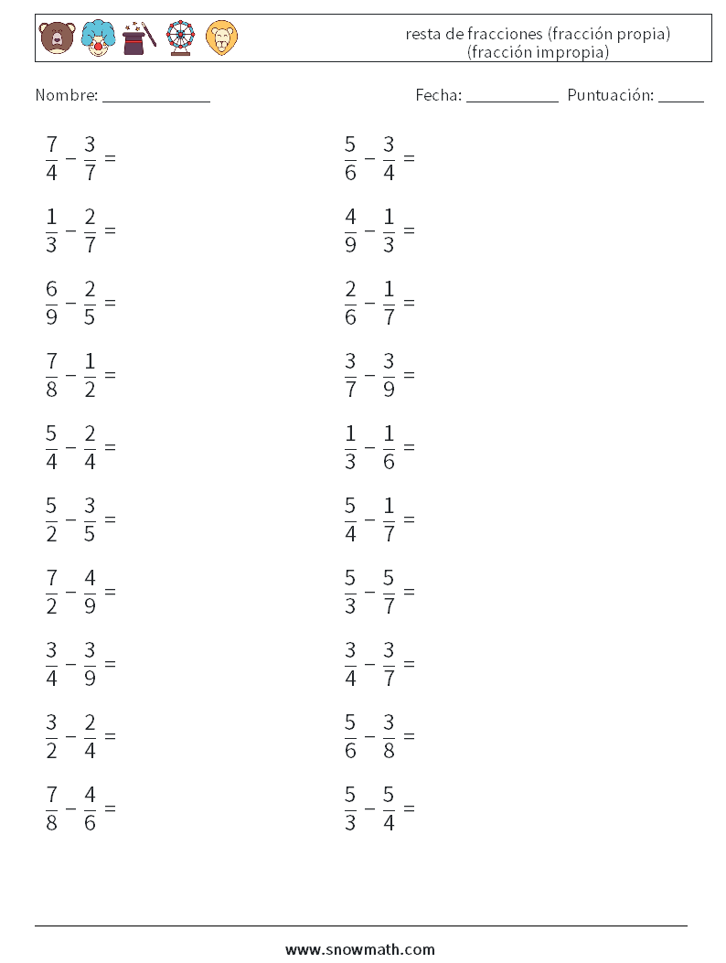 (20) resta de fracciones (fracción propia) (fracción impropia) Hojas de trabajo de matemáticas 5