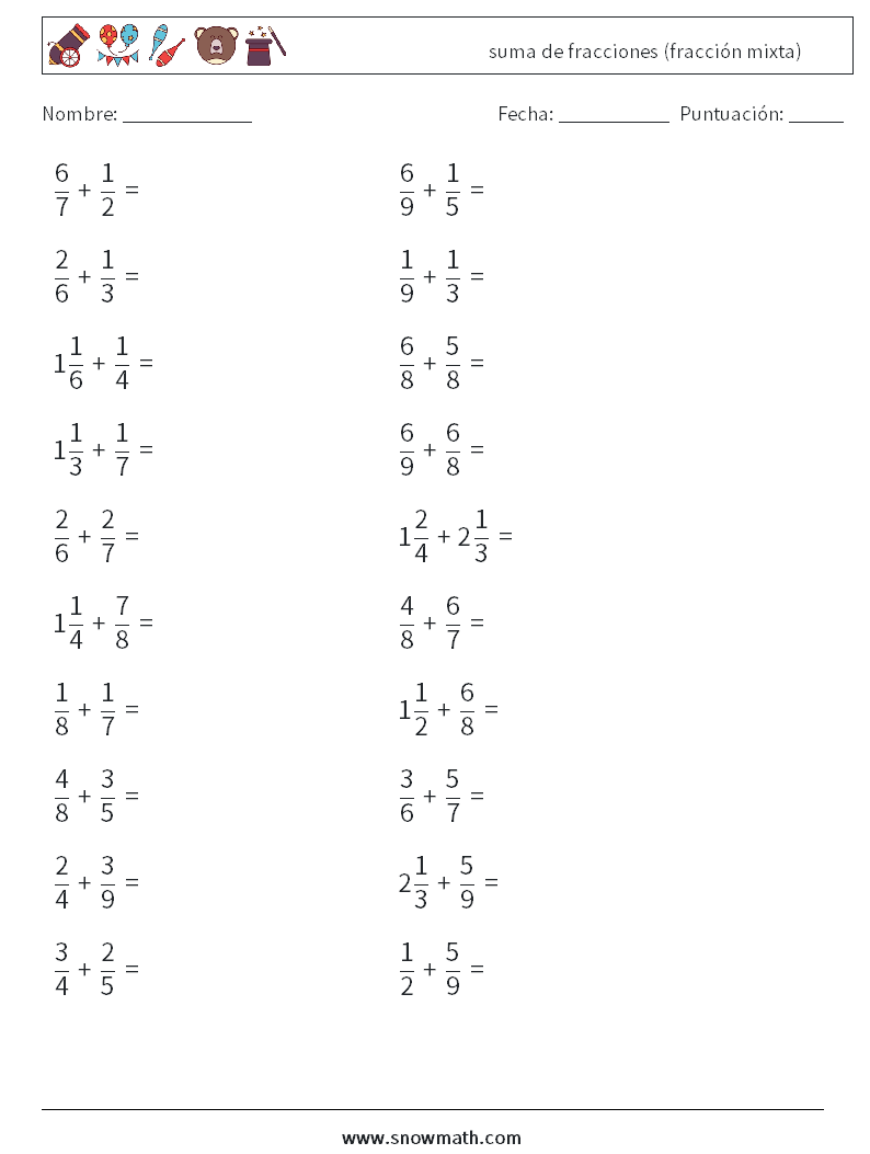 (20) suma de fracciones (fracción mixta) Hojas de trabajo de matemáticas 11