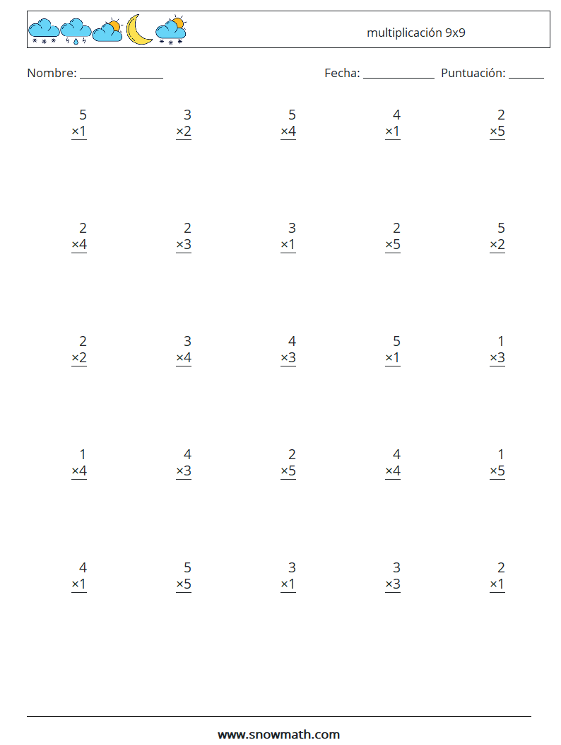 (25 preguntas de matemáticas) Imprime hojas de trabajo de multiplicación de 9x9.