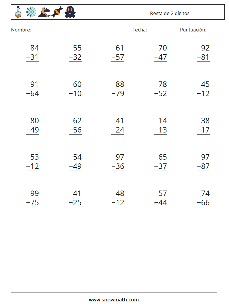 (25 preguntas de matemáticas) Hojas de trabajo de resta de 2 dígitos.
