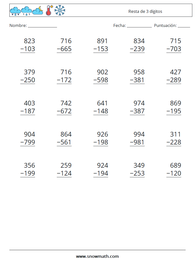 (25) Resta de 3 dígitos Hojas de trabajo de matemáticas 16