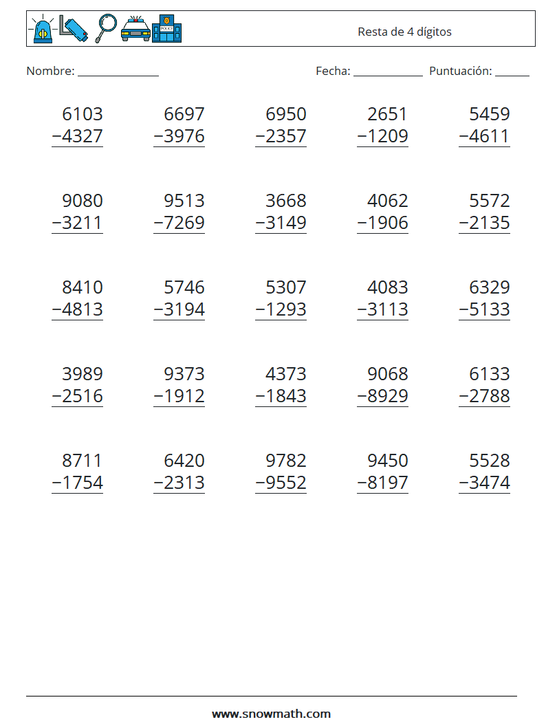 (25) Resta de 4 dígitos Hojas de trabajo de matemáticas 3