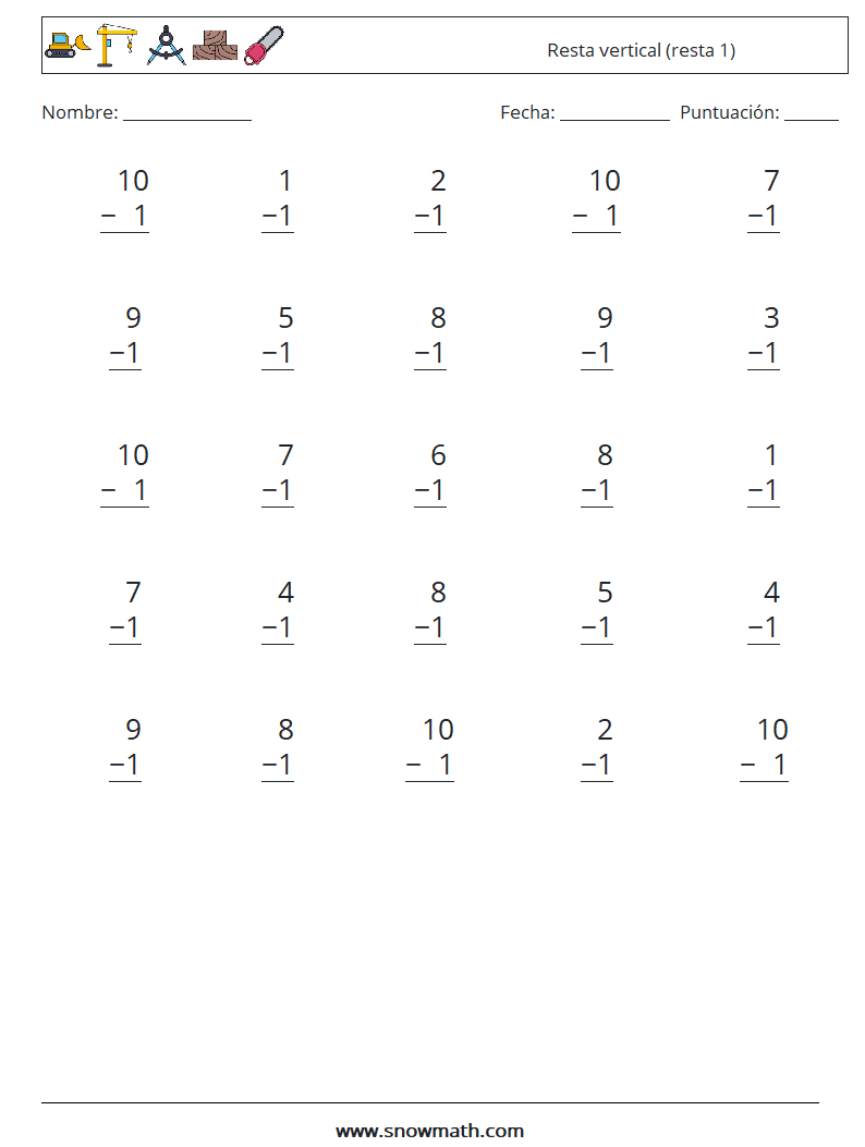 (25) Resta vertical (resta 1) Hojas de trabajo de matemáticas 1