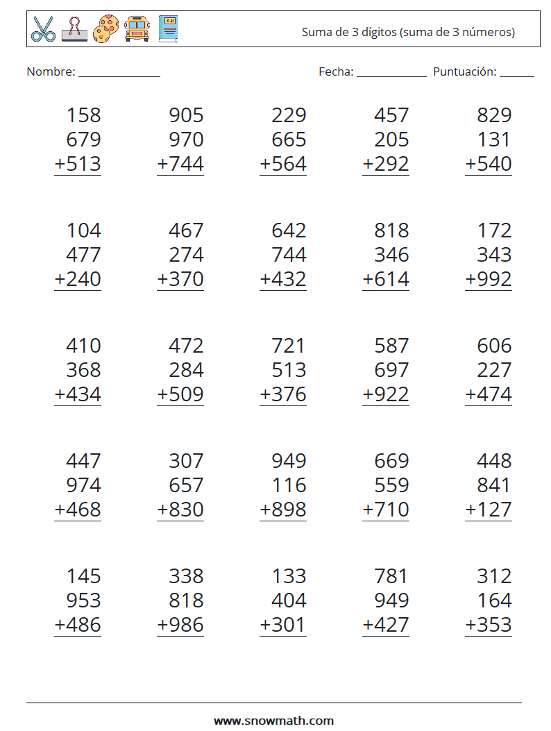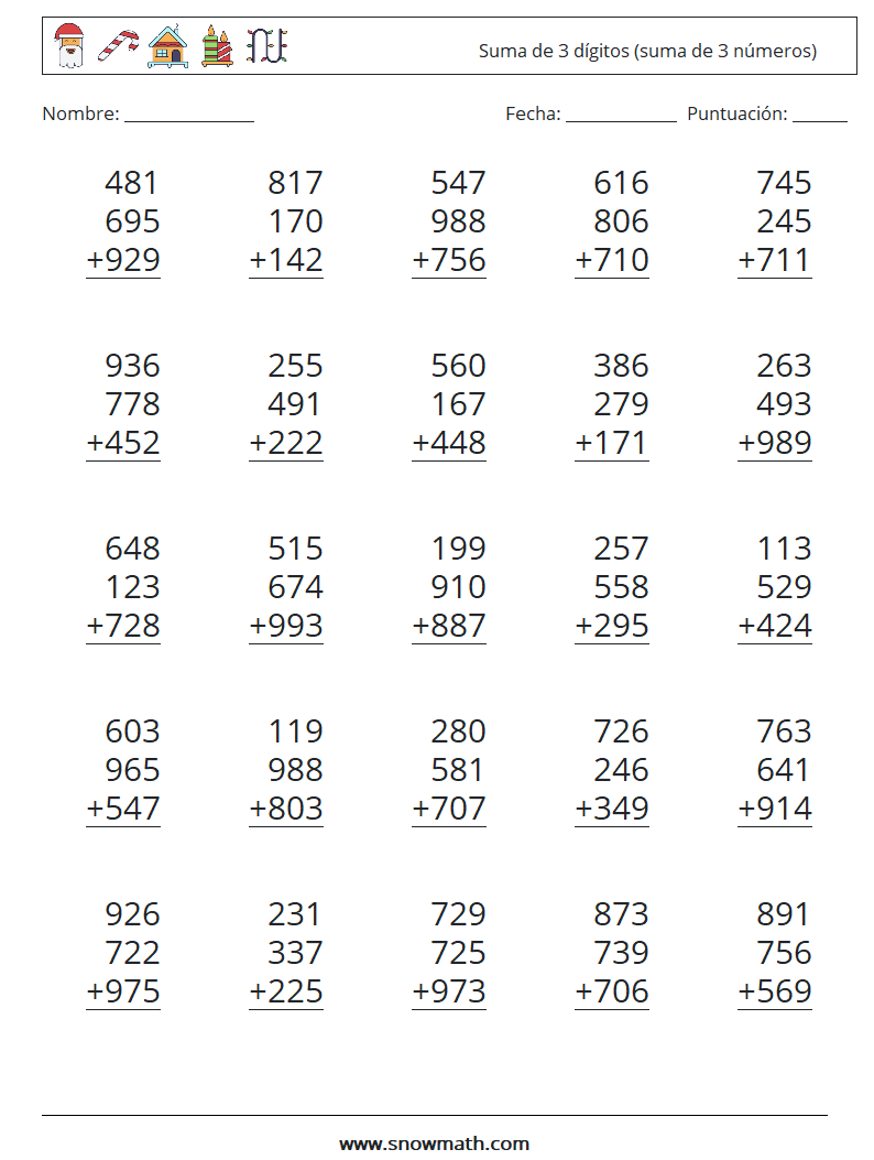 (25 preguntas de matemáticas) Aprenda a sumar, sumar tres números de 3 dígitos, hojas de trabajo de matemáticas imprimibles.