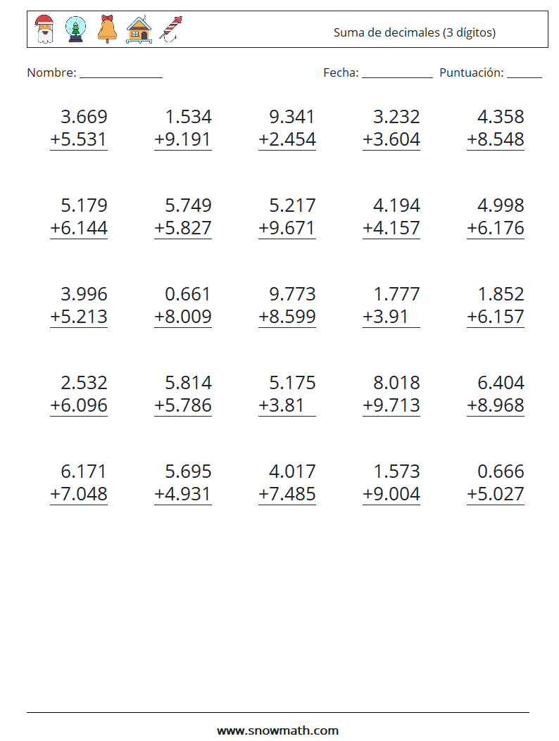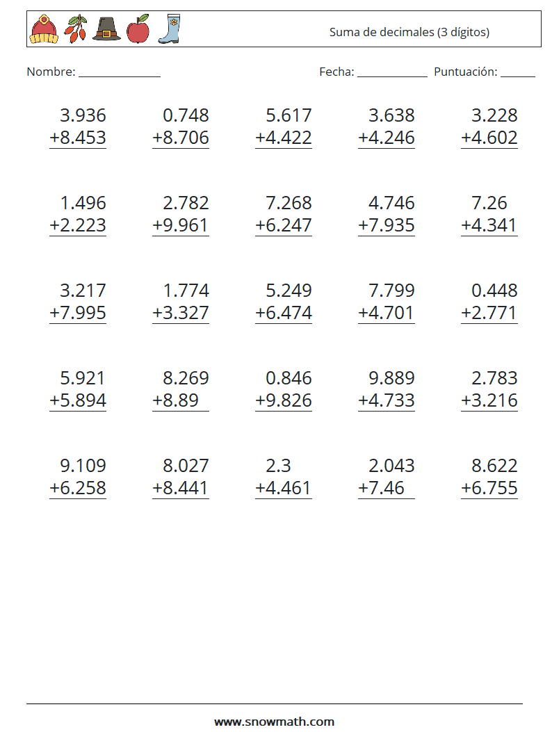 (25) Suma de decimales (3 dígitos) Hojas de trabajo de matemáticas 3