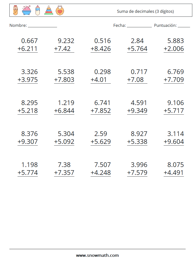 (25) Suma de decimales (3 dígitos) Hojas de trabajo de matemáticas 12