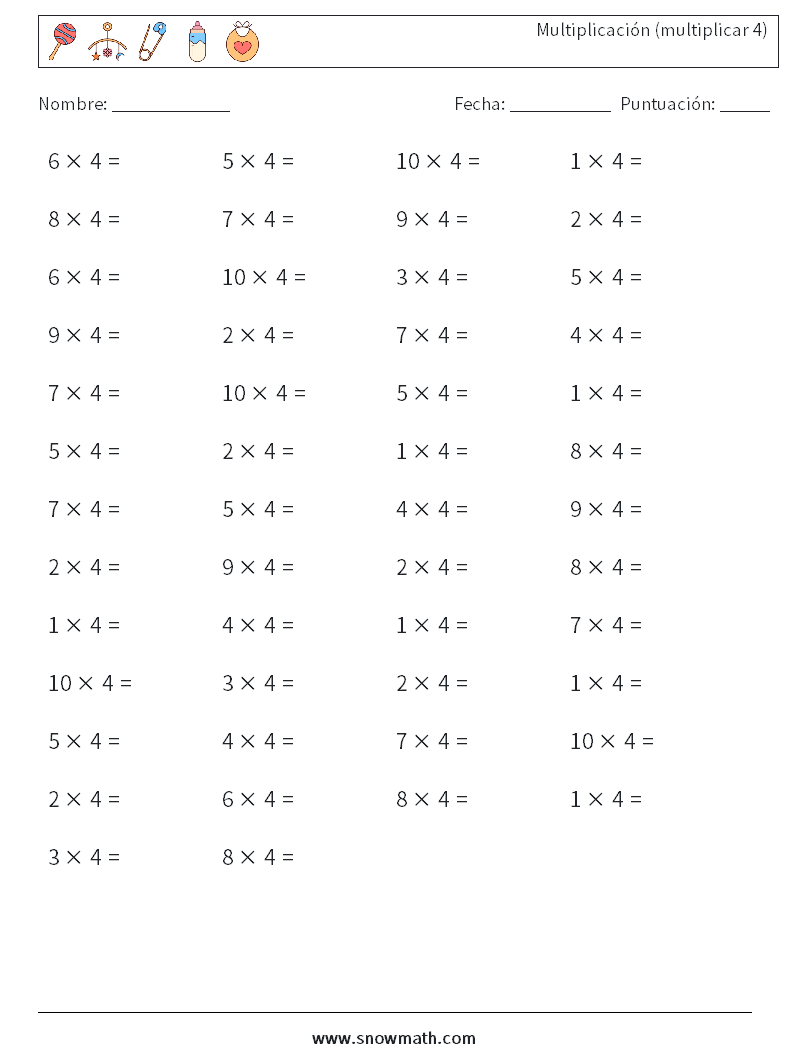 (50) Multiplicación (multiplicar 4) Hojas de trabajo de matemáticas 4