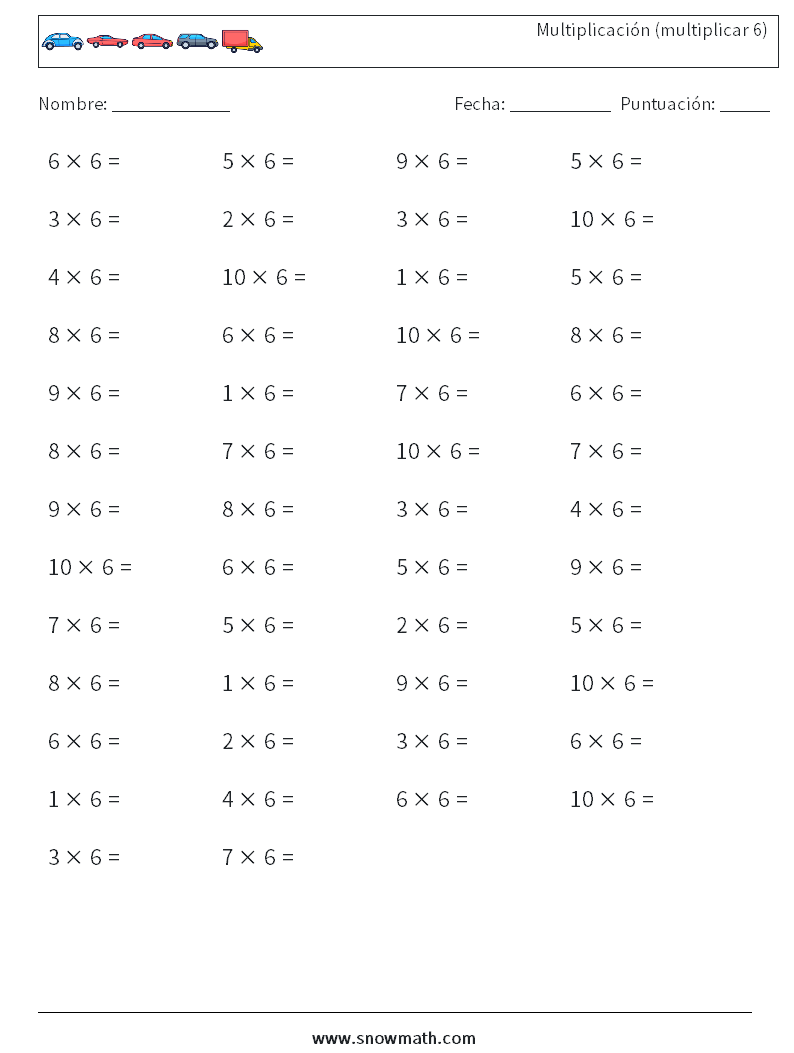 (50) Multiplicación (multiplicar 6) Hojas de trabajo de matemáticas 6