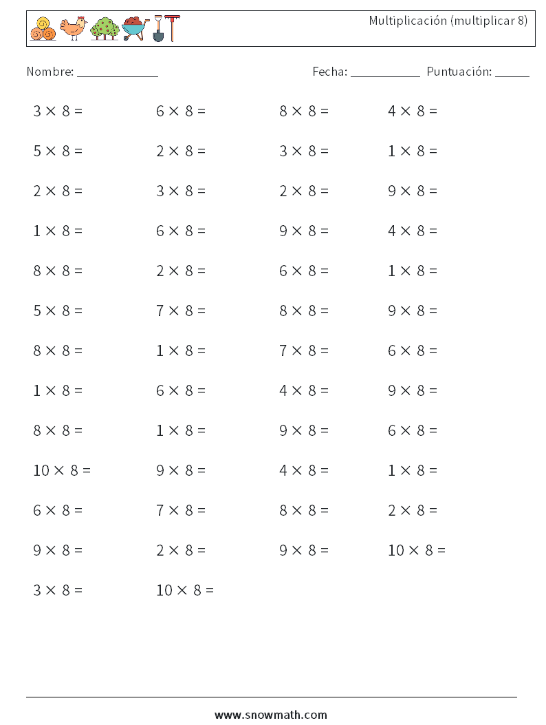 (50) Multiplicación (multiplicar 8) Hojas de trabajo de matemáticas 8