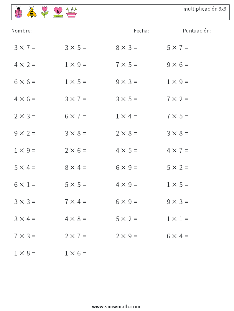 (50) multiplicación 9x9 Hojas de trabajo de matemáticas 8