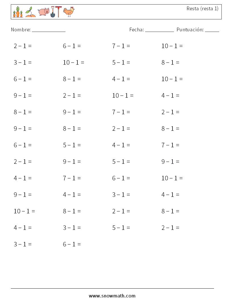 (50) Resta (resta 1) Hojas de trabajo de matemáticas 1