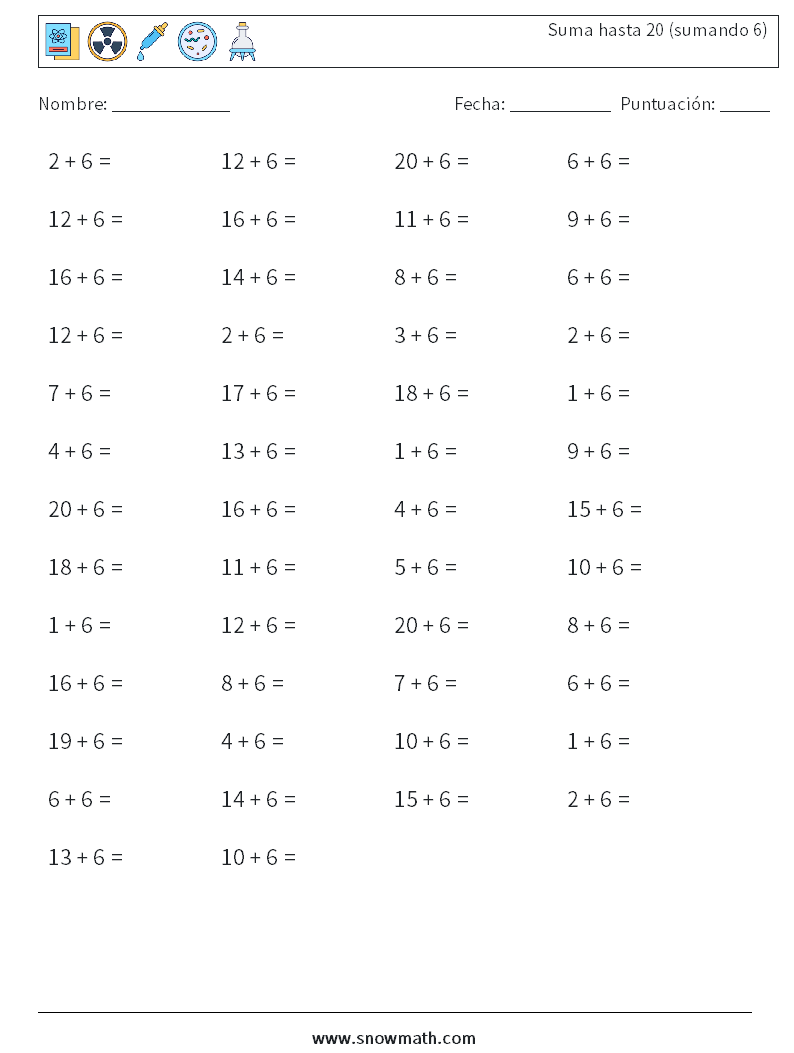 (50) Suma hasta 20 (sumando 6) Hojas de trabajo de matemáticas 6