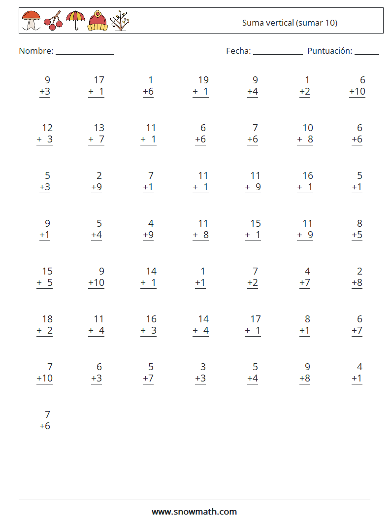(50) Suma vertical (sumar 10) Hojas de trabajo de matemáticas 6