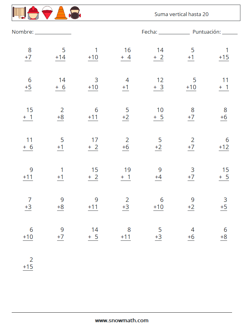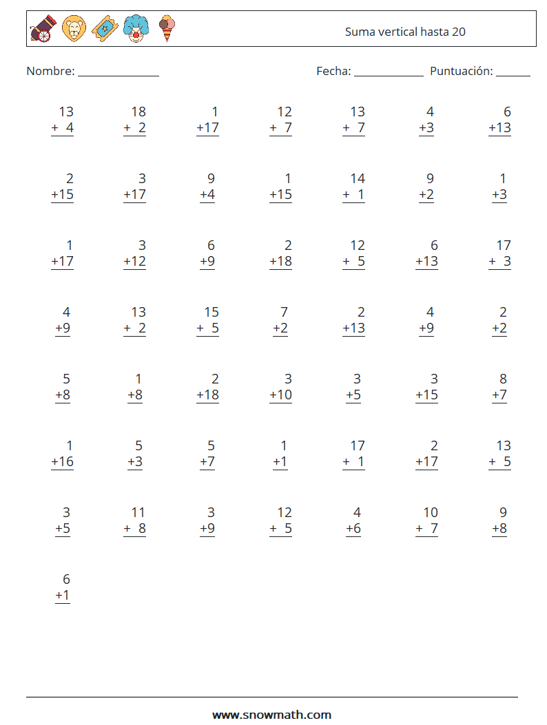 (50) Suma vertical hasta 20 Hojas de trabajo de matemáticas 17
