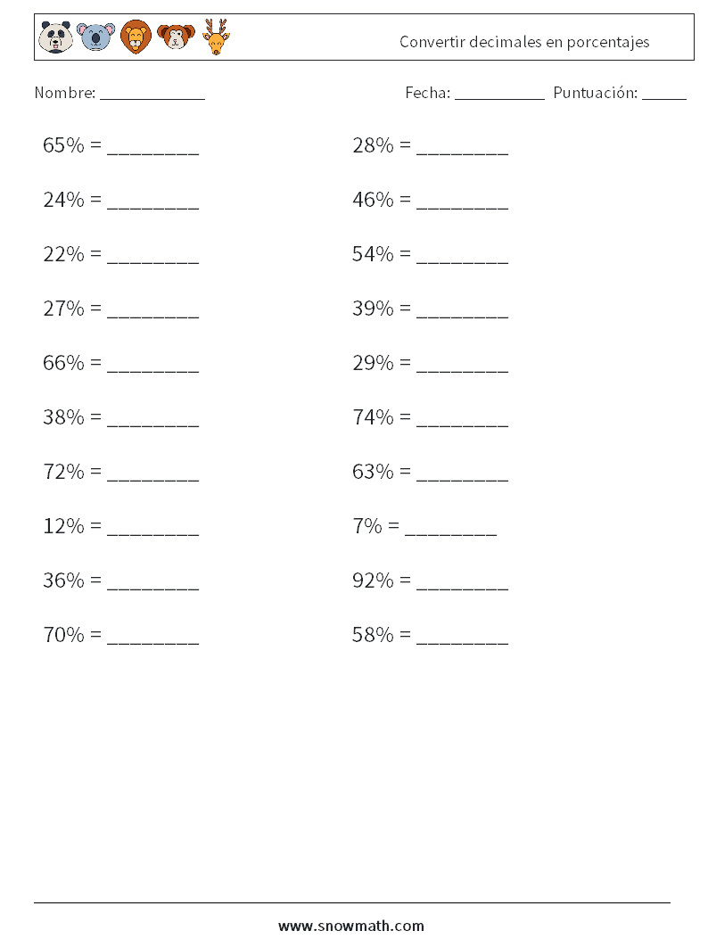 Convertir decimales en porcentajes Hojas de trabajo de matemáticas 2