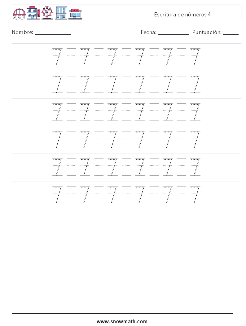 Aprenda a escribir el número 7, hojas de trabajo imprimibles