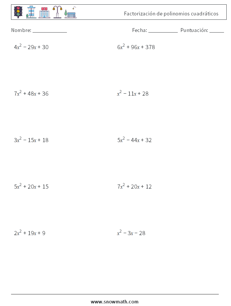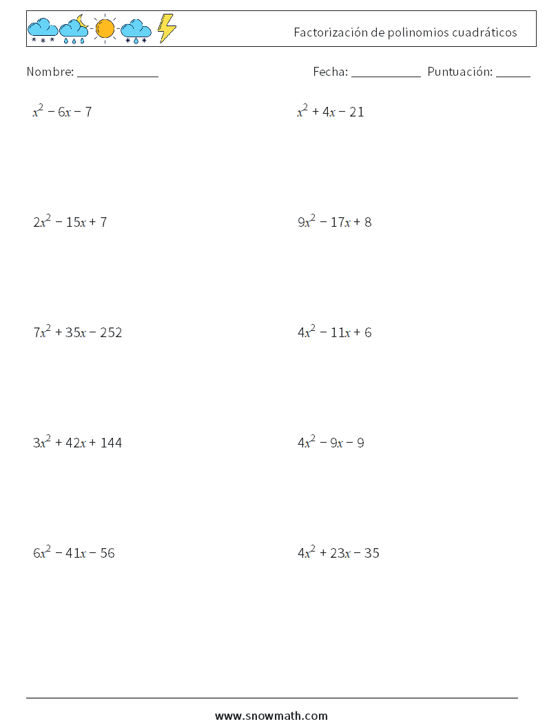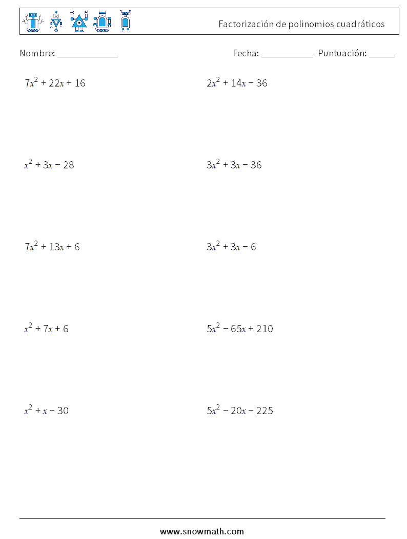 Factorización de polinomios cuadráticos Hojas de trabajo de matemáticas 6
