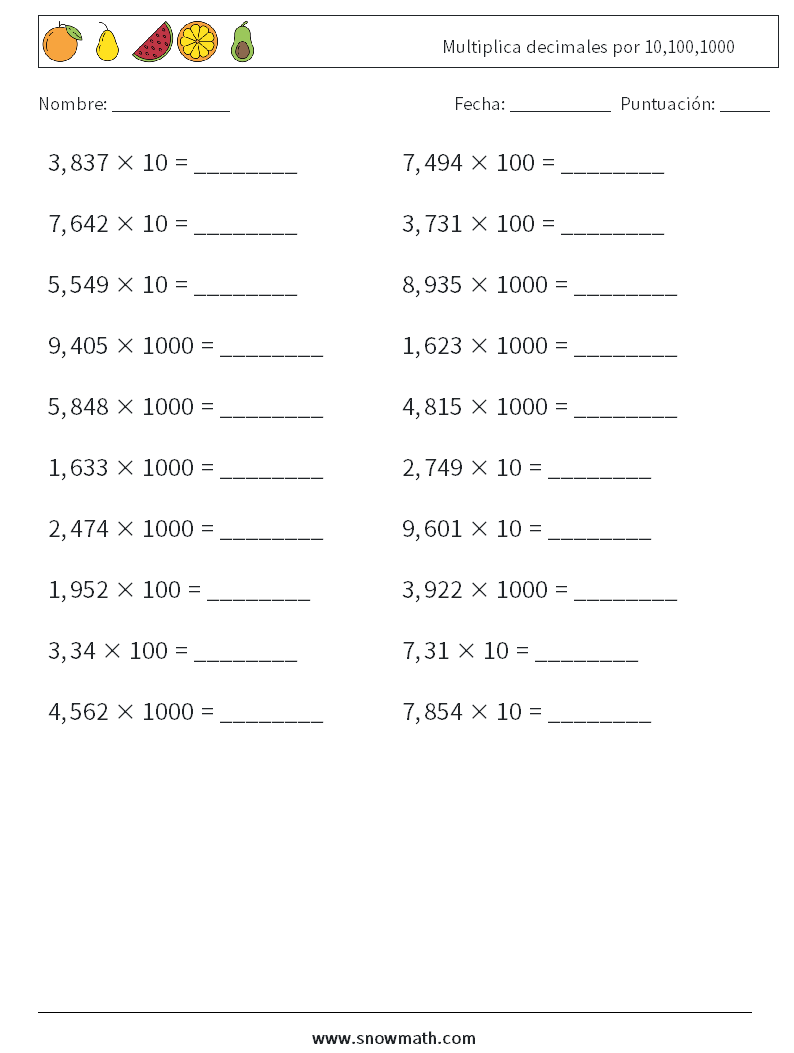 Multiplica decimales por 10,100,1000, hojas de trabajo de matemáticas gratuitas.