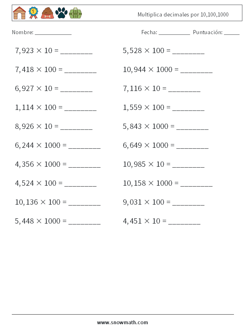 Multiplica decimales por 10,100,1000 Hojas de trabajo de matemáticas 10