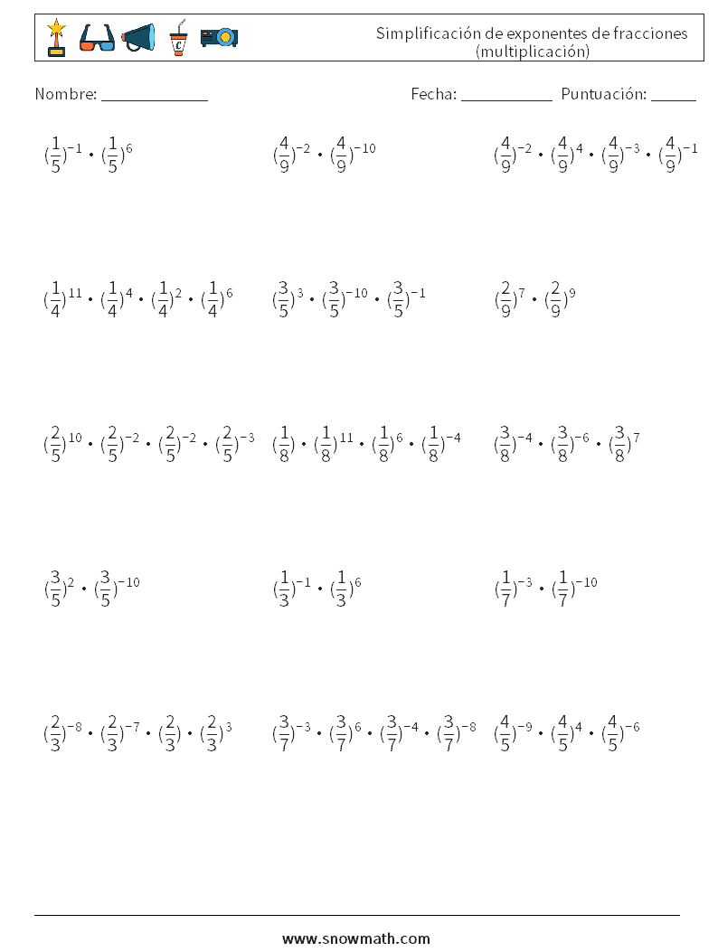 Simplificación de exponentes de fracciones (multiplicación) Hojas de trabajo de matemáticas 9