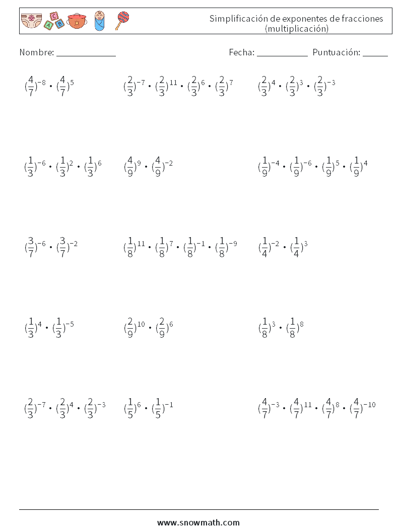 Simplificación de exponentes de fracciones (multiplicación) Hojas de trabajo de matemáticas 7