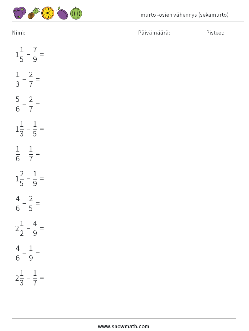 (10) murto -osien vähennys (sekamurto) Matematiikan laskentataulukot 10