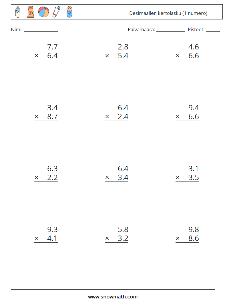 (12) Desimaalien kertolasku (1 numero) Matematiikan laskentataulukot 3