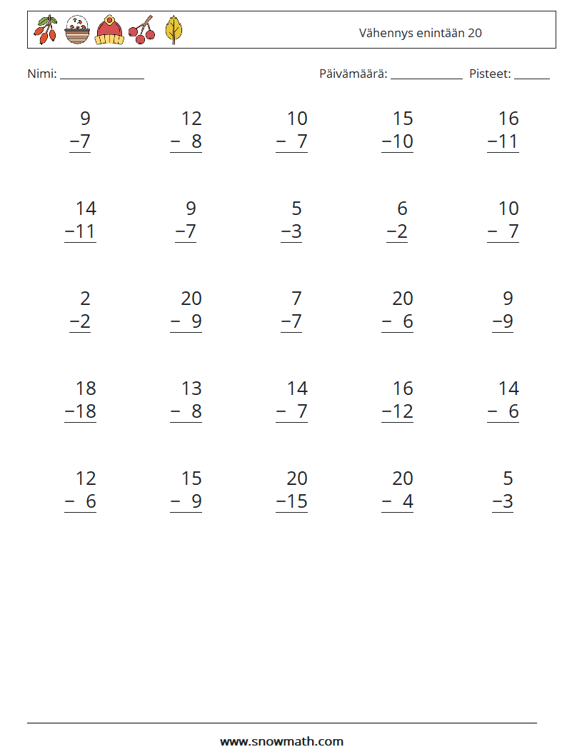 (25 matemaattista kysymystä) Vähennys enintään 20
