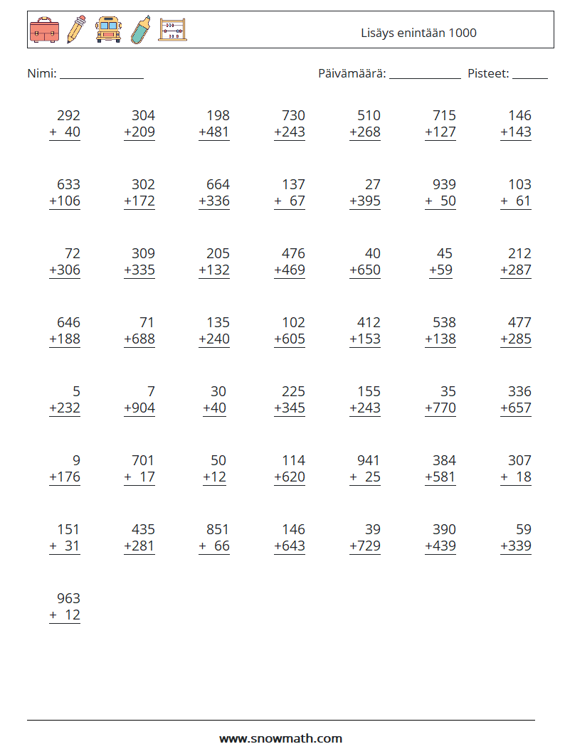 (50) Lisäys enintään 1000 Matematiikan laskentataulukot 10